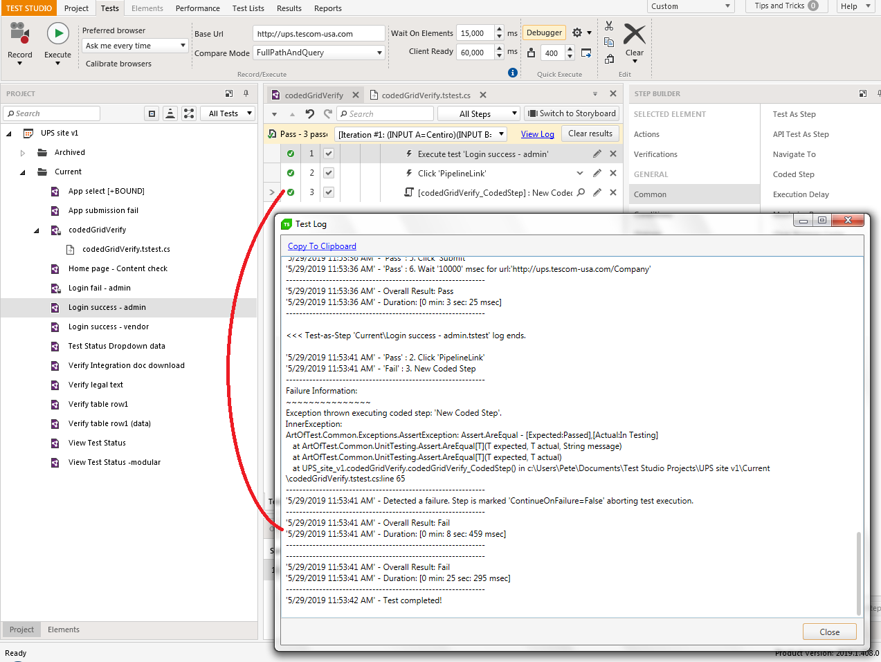 When you use data driven testing in a Test List, the results from all iterations are summarized in the Test Results pane. You can drill down to find the exact step, which failed and check the step failure details.