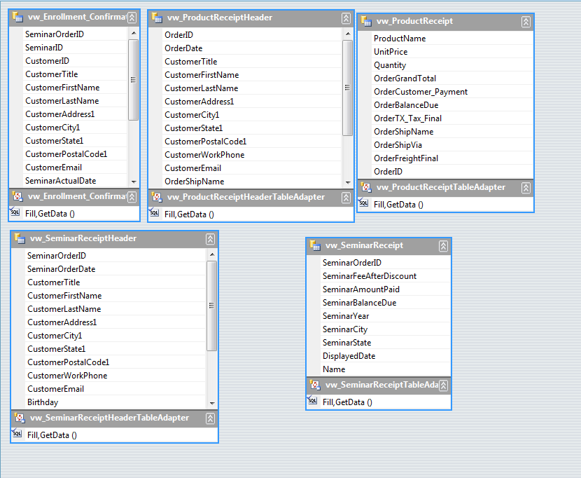 However, I seem to be missing something. On the first report, I associated the DataSource to the DataSet, and the DataMemeber to the DataTable, and the DataTableAdapter was automatically generated. However, I apparently missed the magic that made this happen, because I can't seem to duplicate this in later reports. I set the DataSource and DataMember, but the DataTableAdapter never gets created, and when I run the report, no data is found.