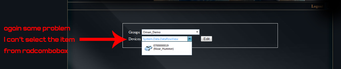 <telerik:RadComboBox ID="ddlDevices" runat="server" Width="200px" MarkFirstMatch="true" AutoPostBack="false" Visible="false">
