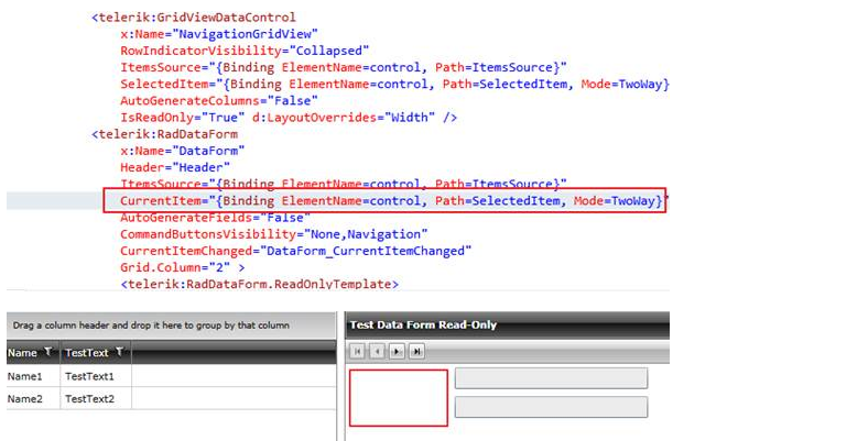 Moreover the custom CurrentItem dependency property does not update the bound object from the viewmodel , although it was set explicitly to “Mode=TwoWay”. > see screenshot #5