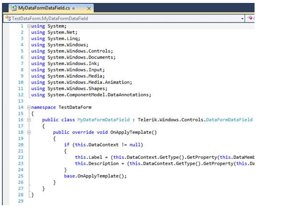 The first problem we encountered was that data annotations are not passed through when the RadDataForm is in mode “AutoGenerateFields = False”. As a workaround we created an own control inherited from DataFormDataField where we read out the display attribute by reflection and set the values to the related Label and Description properties in the OnApplyTemplate event handler. Please also refer to http://www.telerik.com/community/forums/silverlight/data-form/display-annotation.aspx > see screenshot #3