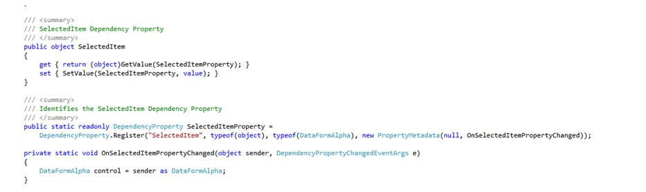 We introduced new DependencyProperties in the custom control to expose properties from the nested controls and used element to element binding inside XAML to share them with the grid and the dataform. > see screenshot #2