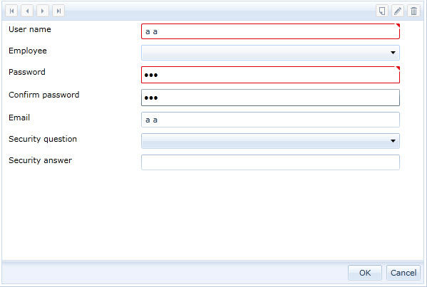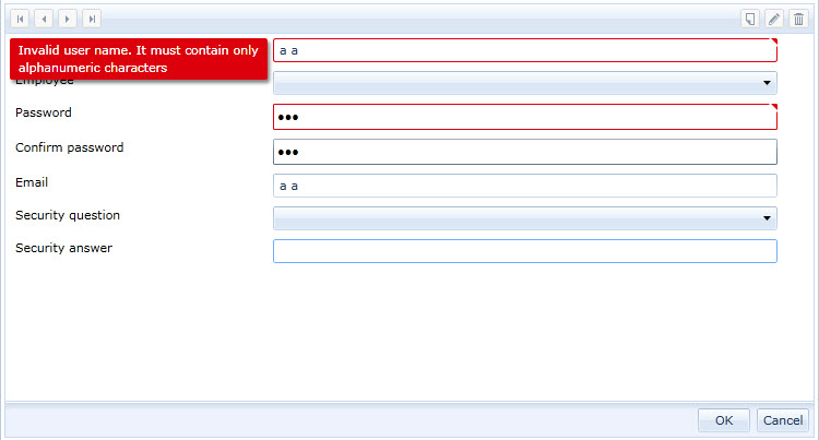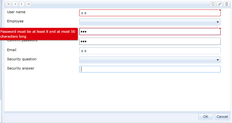 <telerik:RadDataForm x:Name="dataFormUser" ItemsSource="{Binding Users, Mode=TwoWay}" CurrentItem="{Binding SelectedUser, Mode=TwoWay}" AutoGenerateFields="False" AutoEdit="False" AutoCommit="False" Margin="2" DeletingItem="dataFormUser_DeletingItem"> <i:Interaction.Triggers> <i:EventTrigger EventName="EditEnded"> <mvvmlightcmd:EventToCommand Command="{Binding EditEndedCommand}" /> </i:EventTrigger> </i:Interaction.Triggers> <telerik:RadDataForm.NewItemTemplate> <DataTemplate> <Grid> <Grid.RowDefinitions> <RowDefinition Height="Auto" /> <RowDefinition Height="Auto" /> <RowDefinition Height="Auto" /> <RowDefinition Height="Auto" /> <RowDefinition Height="Auto" /> <RowDefinition Height="Auto" /> <RowDefinition Height="Auto" /> </Grid.RowDefinitions> <telerik:DataFormDataField Grid.Row="0" DataMemberBinding="{Binding UserName, Mode=TwoWay}" Label="{Binding Path=RegistrationDataStrings.UserNameLabel, Source={StaticResource ResourceWrapper}}"/> <telerik:DataFormDataField Grid.Row="1" x:Name="fieldEmploye" Loaded="fieldEmploye_Loaded" Label="{Binding Path=RegistrationDataStrings.Employee, Source={StaticResource ResourceWrapper}}" > <telerik:RadComboBox IsEditable="False" ItemTemplate="{StaticResource AvocatItemTemplate}" SelectedValuePath="AvocatID" SelectedValue="{Binding SelectedUserAvocat, Mode=TwoWay}" Name="radComboBoxEmploye" Loaded="radComboBoxEmploye_Loaded"/> </telerik:DataFormDataField> <telerik:DataFormDataField Grid.Row="2" Label="{Binding Path=RegistrationDataStrings.PasswordLabel, Source={StaticResource ResourceWrapper}}"> <PasswordBox Password="{Binding Password, Mode=TwoWay}" Name="PasswordBox" Loaded="PasswordBox_Loaded" /> </telerik:DataFormDataField> <telerik:DataFormDataField Grid.Row="3" Label="{Binding Path=RegistrationDataStrings.PasswordConfirmationLabel, Source={StaticResource ResourceWrapper}}"> <PasswordBox Password="{Binding PasswordConfirmation, Mode=TwoWay}" Name="PasswordConfirmationBox" Loaded="PasswordConfirmationBox_Loaded" /> </telerik:DataFormDataField> <telerik:DataFormDataField Grid.Row="4" DataMemberBinding="{Binding Email, NotifyOnValidationError=True, ValidatesOnDataErrors=True, ValidatesOnExceptions=True}" Label="{Binding Path=RegistrationDataStrings.EmailLabel, Source={StaticResource ResourceWrapper}}"/> <telerik:DataFormDataField Grid.Row="5" Grid.ColumnSpan="2" Label="{Binding Path=RegistrationDataStrings.SecurityQuestionLabel, Source={StaticResource ResourceWrapper}}"> <telerik:RadComboBox IsEditable="False" SelectedValue="{Binding Question, Mode=TwoWay}" Name="radComboBoxQuestion" Loaded="radComboBoxQuestion_Loaded" /> </telerik:DataFormDataField> <telerik:DataFormDataField Grid.Row="6" Grid.ColumnSpan="2" DataMemberBinding="{Binding Answer, Mode=TwoWay, NotifyOnValidationError=True, ValidatesOnDataErrors=True, ValidatesOnExceptions=True}" Label="{Binding Path=RegistrationDataStrings.SecurityAnswerLabel, Source={StaticResource ResourceWrapper}}"/> </Grid> </DataTemplate> </telerik:RadDataForm.NewItemTemplate></telerik:RadDataForm>To avoid adding to an already long post, Im not including my view's code-behind or my viewModel's code since it is quite lenghty and irrelevant (I think) to this problem.