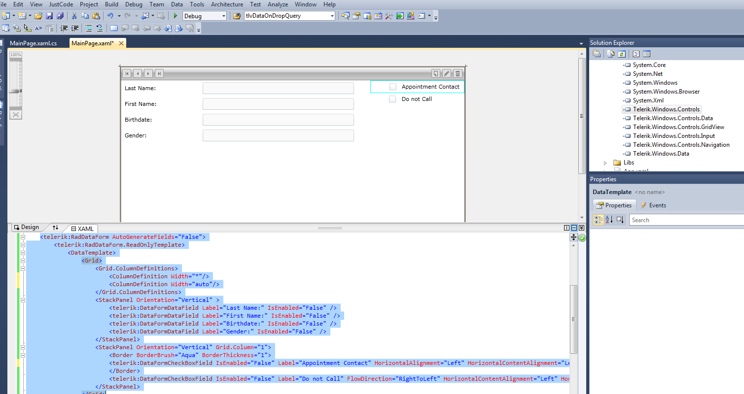 <telerik:RadDataForm AutoGenerateFields="False"> <telerik:RadDataForm.ReadOnlyTemplate> <DataTemplate> <Grid> <Grid.ColumnDefinitions> <ColumnDefinition Width="*" /> <ColumnDefinition Width="450" /></Grid.ColumnDefinitions> <StackPanel Orientation="Vertical" > <telerik:DataFormDataField Label="Last Name:" IsEnabled="False" /> <telerik:DataFormDataField Label="First Name:" IsEnabled="False" /> <telerik:DataFormDataField Label="Birthdate:" IsEnabled="False" /> <telerik:DataFormDataField Label="Gender:" IsEnabled="False" /> </StackPanel> <StackPanel Orientation="Vertical" Grid.Column="1"> <telerik:DataFormCheckBoxField IsEnabled="False" Label="Appointment Contact" FlowDirection="RightToLeft" HorizontalAlignment="Left" HorizontalContentAlignment="Left" /> <telerik:DataFormCheckBoxField IsEnabled="False" Label="Do not Call" FlowDirection="RightToLeft" HorizontalAlignment="Left" /> </StackPanel> </Grid> </DataTemplate> </telerik:RadDataForm.ReadOnlyTemplate> </telerik:RadDataForm>