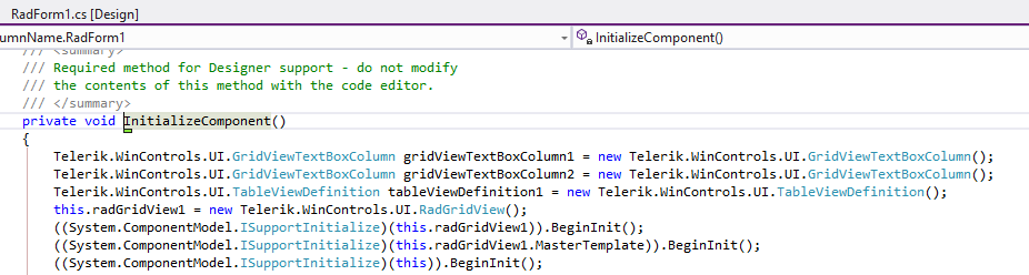 Just below the InitializeComponent method, it is possible to see what are the exposed properties for accessing from the RadForm1.cs file. Note that it is not recommended to manipulate the Designer.cs file as it is expected to serialize the design time changes, but it is possible to define the columns outside the method as it is demonstrated below: