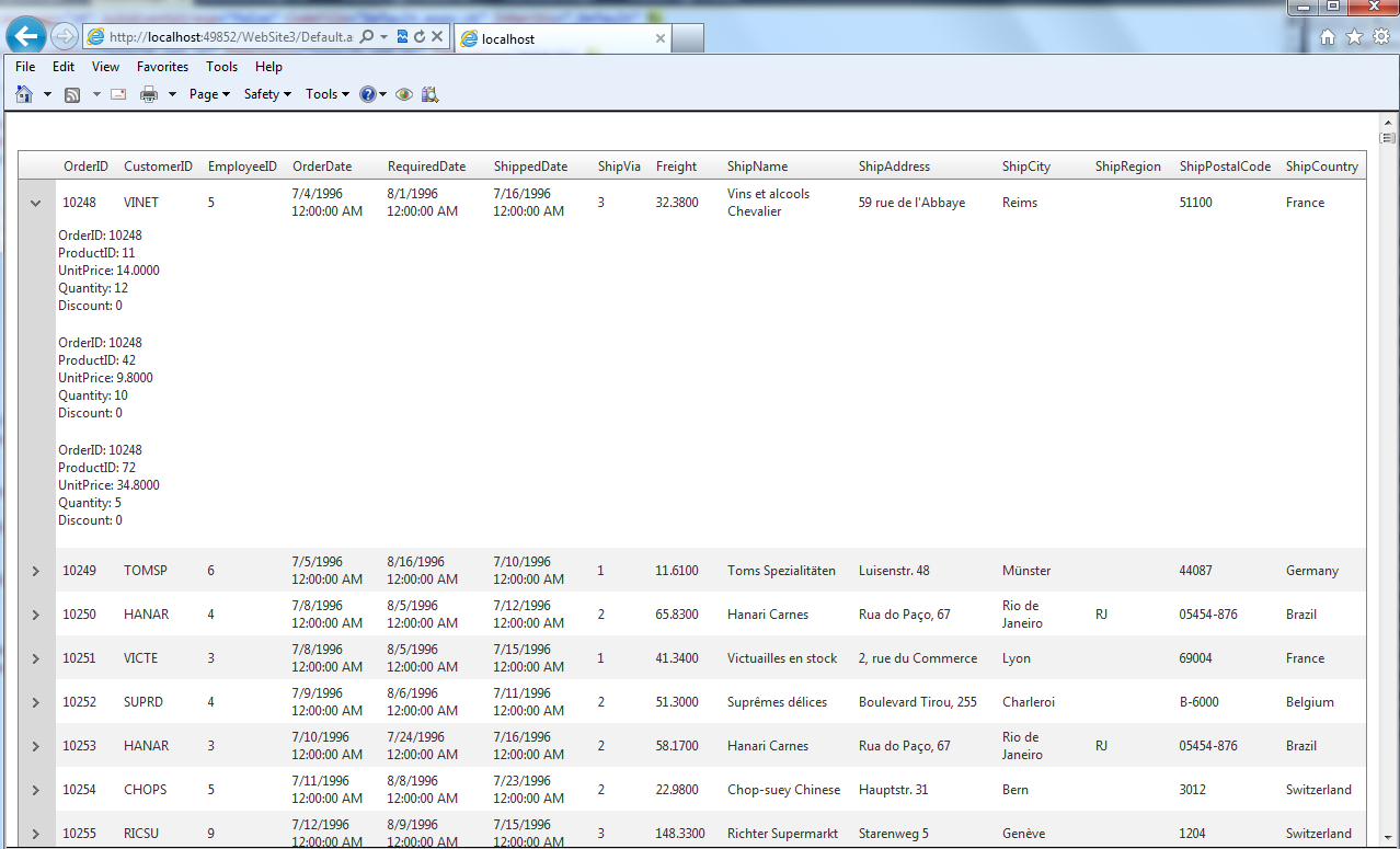 <%@ Page Language="VB" AutoEventWireup="false" CodeFile="Default.aspx.vb" Inherits="_Default" %><%@ Register Assembly="Telerik.Web.UI" Namespace="Telerik.Web.UI" TagPrefix="telerik" %><!DOCTYPE html PUBLIC "-//W3C//DTD XHTML 1.0 Transitional//EN" "http://www.w3.org/TR/xhtml1/DTD/xhtml1-transitional.dtd"><html xmlns="http://www.w3.org/1999/xhtml"><head runat="server"> <title></title></head><body> <form id="form1" runat="server"> <telerik:RadScriptManager ID="RadScriptManager1" runat="server"> <Scripts> <asp:ScriptReference Assembly="Telerik.Web.UI" Name="Telerik.Web.UI.Common.Core.js"> </asp:ScriptReference> <asp:ScriptReference Assembly="Telerik.Web.UI" Name="Telerik.Web.UI.Common.jQuery.js"> </asp:ScriptReference> <asp:ScriptReference Assembly="Telerik.Web.UI" Name="Telerik.Web.UI.Common.jQueryInclude.js"> </asp:ScriptReference> </Scripts> </telerik:RadScriptManager> <div> <telerik:RadGrid ID="RadGrid1" runat="server" CellSpacing="0" DataSourceID="SqlDataSource1" GridLines="None"><MasterTableView AutoGenerateColumns="False" DataKeyNames="OrderID" DataSourceID="SqlDataSource1"><ParentTableRelation> <telerik:GridRelationFields DetailKeyField="OrderID" MasterKeyField="OrderID" /> </ParentTableRelation> <NestedViewTemplate> <asp:DataList ID="DataList1" runat="server" DataKeyField="OrderID" DataSourceID="SqlDataSource2"> <ItemTemplate> OrderID: <asp:Label ID="OrderIDLabel" runat="server" Text='<%# Eval("OrderID") %>' /> <br /> ProductID: <asp:Label ID="ProductIDLabel" runat="server" Text='<%# Eval("ProductID") %>' /> <br /> UnitPrice: <asp:Label ID="UnitPriceLabel" runat="server" Text='<%# Eval("UnitPrice") %>' /> <br /> Quantity: <asp:Label ID="QuantityLabel" runat="server" Text='<%# Eval("Quantity") %>' /> <br /> Discount: <asp:Label ID="DiscountLabel" runat="server" Text='<%# Eval("Discount") %>' /> <br /><br /> </ItemTemplate> </asp:DataList> </NestedViewTemplate> <NestedViewSettings DataSourceID="SqlDataSource2"> <ParentTableRelation> <telerik:GridRelationFields DetailKeyField="OrderID" MasterKeyField="OrderID" /> </ParentTableRelation> </NestedViewSettings><CommandItemSettings ExportToPdfText="Export to PDF"></CommandItemSettings><RowIndicatorColumn Visible="True" FilterControlAltText="Filter RowIndicator column"><HeaderStyle Width="20px"></HeaderStyle></RowIndicatorColumn><ExpandCollapseColumn Visible="True" FilterControlAltText="Filter ExpandColumn column"><HeaderStyle Width="20px"></HeaderStyle></ExpandCollapseColumn> <Columns> <telerik:GridBoundColumn DataField="OrderID" DataType="System.Int32" FilterControlAltText="Filter OrderID column" HeaderText="OrderID" ReadOnly="True" SortExpression="OrderID" UniqueName="OrderID"> </telerik:GridBoundColumn> <telerik:GridBoundColumn DataField="CustomerID" FilterControlAltText="Filter CustomerID column" HeaderText="CustomerID" SortExpression="CustomerID" UniqueName="CustomerID"> </telerik:GridBoundColumn> <telerik:GridBoundColumn DataField="EmployeeID" DataType="System.Int32" FilterControlAltText="Filter EmployeeID column" HeaderText="EmployeeID" SortExpression="EmployeeID" UniqueName="EmployeeID"> </telerik:GridBoundColumn> <telerik:GridBoundColumn DataField="OrderDate" DataType="System.DateTime" FilterControlAltText="Filter OrderDate column" HeaderText="OrderDate" SortExpression="OrderDate" UniqueName="OrderDate"> </telerik:GridBoundColumn> <telerik:GridBoundColumn DataField="RequiredDate" DataType="System.DateTime" FilterControlAltText="Filter RequiredDate column" HeaderText="RequiredDate" SortExpression="RequiredDate" UniqueName="RequiredDate"> </telerik:GridBoundColumn> <telerik:GridBoundColumn DataField="ShippedDate" DataType="System.DateTime" FilterControlAltText="Filter ShippedDate column" HeaderText="ShippedDate" SortExpression="ShippedDate" UniqueName="ShippedDate"> </telerik:GridBoundColumn> <telerik:GridBoundColumn DataField="ShipVia" DataType="System.Int32" FilterControlAltText="Filter ShipVia column" HeaderText="ShipVia" SortExpression="ShipVia" UniqueName="ShipVia"> </telerik:GridBoundColumn> <telerik:GridBoundColumn DataField="Freight" DataType="System.Decimal" FilterControlAltText="Filter Freight column" HeaderText="Freight" SortExpression="Freight" UniqueName="Freight"> </telerik:GridBoundColumn> <telerik:GridBoundColumn DataField="ShipName" FilterControlAltText="Filter ShipName column" HeaderText="ShipName" SortExpression="ShipName" UniqueName="ShipName"> </telerik:GridBoundColumn> <telerik:GridBoundColumn DataField="ShipAddress" FilterControlAltText="Filter ShipAddress column" HeaderText="ShipAddress" SortExpression="ShipAddress" UniqueName="ShipAddress"> </telerik:GridBoundColumn> <telerik:GridBoundColumn DataField="ShipCity" FilterControlAltText="Filter ShipCity column" HeaderText="ShipCity" SortExpression="ShipCity" UniqueName="ShipCity"> </telerik:GridBoundColumn> <telerik:GridBoundColumn DataField="ShipRegion" FilterControlAltText="Filter ShipRegion column" HeaderText="ShipRegion" SortExpression="ShipRegion" UniqueName="ShipRegion"> </telerik:GridBoundColumn> <telerik:GridBoundColumn DataField="ShipPostalCode" FilterControlAltText="Filter ShipPostalCode column" HeaderText="ShipPostalCode" SortExpression="ShipPostalCode" UniqueName="ShipPostalCode"> </telerik:GridBoundColumn> <telerik:GridBoundColumn DataField="ShipCountry" FilterControlAltText="Filter ShipCountry column" HeaderText="ShipCountry" SortExpression="ShipCountry" UniqueName="ShipCountry"> </telerik:GridBoundColumn> </Columns><EditFormSettings><EditColumn FilterControlAltText="Filter EditCommandColumn column"></EditColumn></EditFormSettings></MasterTableView><FilterMenu EnableImageSprites="False"></FilterMenu> </telerik:RadGrid> <asp:SqlDataSource ID="SqlDataSource1" runat="server" ConnectionString="<%$ ConnectionStrings:NorthwindConnectionString %>" SelectCommand="SELECT * FROM [Orders]"></asp:SqlDataSource> <asp:SqlDataSource ID="SqlDataSource2" runat="server" ConnectionString="<%$ ConnectionStrings:NorthwindConnectionString %>" SelectCommand="SELECT OrderI
