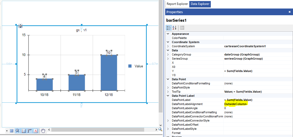 The property which defines the position of the label is DataPointLabelAlignment. It can be changed by clicking on the barSeries-> go to the menu with Properties -> set DataPointLabelAlignment to OutsideColumn. Check the attached screenshot for additional reference.