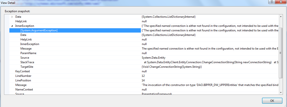 Yes, appears that's something is wrong with the connection string, but it is defined on app.config file. Attached the inner exception
