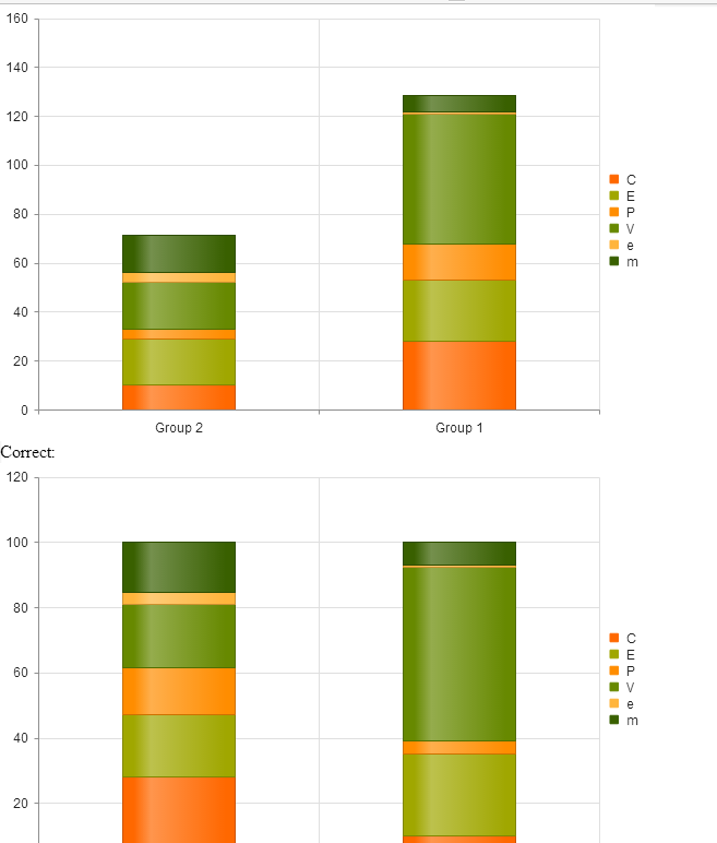 The Chart is displayed in Firefox without a problem, everything adds up and the stacks are correctly aligned. But when I display the same chart with Chrome the stacks are wrong. Meaning that the stack of category A contains elements with category B and vice versa.