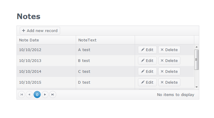 { "note": [ { "NoteID": "1", "NoteDate": "10/10/2012", "NoteText": "A test" }, { "NoteID": "2", "NoteDate": "10/10/2013", "NoteText": "B test" }, { "NoteID": "3", "NoteDate": "10/10/2014", "NoteText": "C test" }, { "NoteID": "4", "NoteDate": "10/10/2015", "NoteText": "D test" }, { "NoteID": "5", "NoteDate": "10/10/2016", "NoteText": "E test" }, { "NoteID": "6", "NoteDate": "10/10/2017", "NoteText": "F test" }, { "NoteID": "7", "NoteDate": "10/10/2018", "NoteText": "G test" } ]}the create/update/destroy function is not working