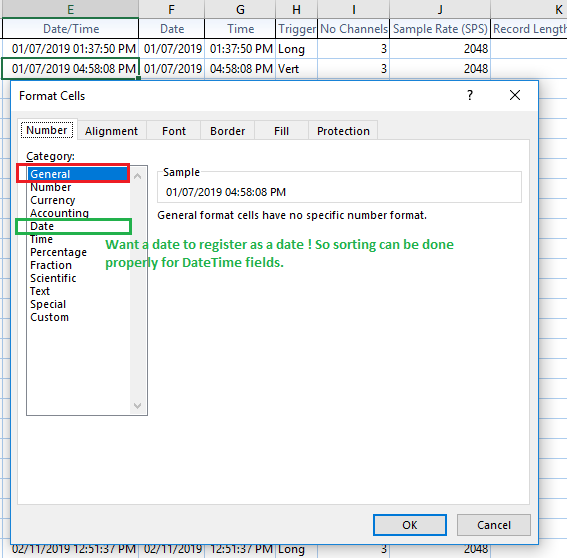 How do I get Excel to see them (checkboxed) as either "Date" (for date columns/cells) or "Time" (for time columns/cells)...instead of "General" ?