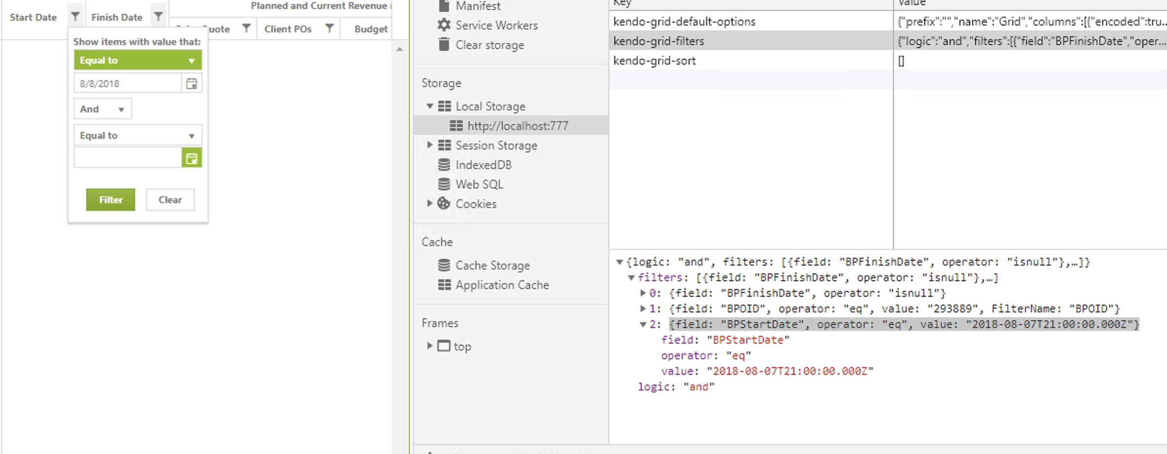 Everything is working fine except filter for Date columns. For example, i set filter "equal to 08.08.2018", it filters the column. Then I leave the page and filter stored in local cache is "{field: "BPStartDate", operator: "eq", value: "2018-08-07T21:00:00.000Z"}". Then I visit the page again and I see that filter is kinda applied (filter icon is highlighted and has correct value) but I can't see filtered data.