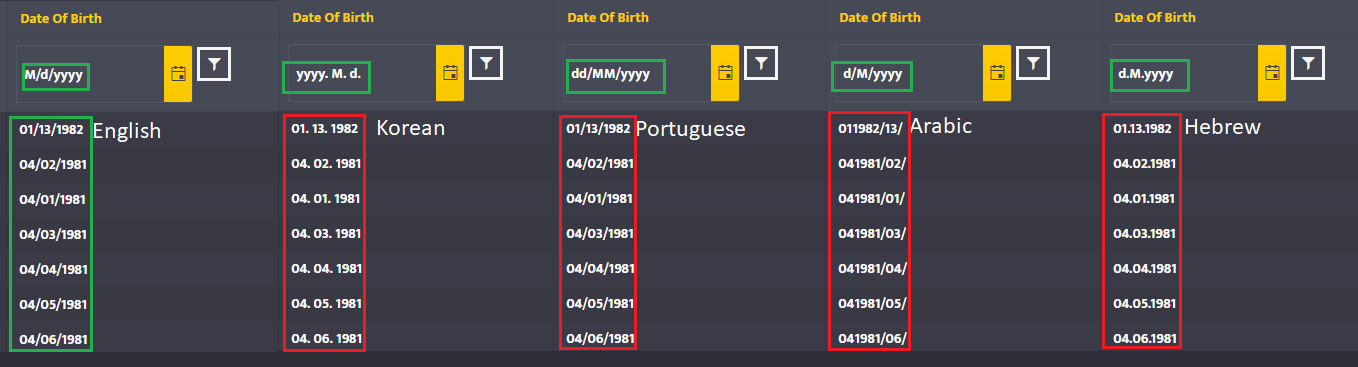 yeah! you are right, but I am using the Telerik grid where the date filter shows the date format-based culture selected as looks like in the attached image. the column of the date data format is displayed wrong. can you please let me know how can fix this issue