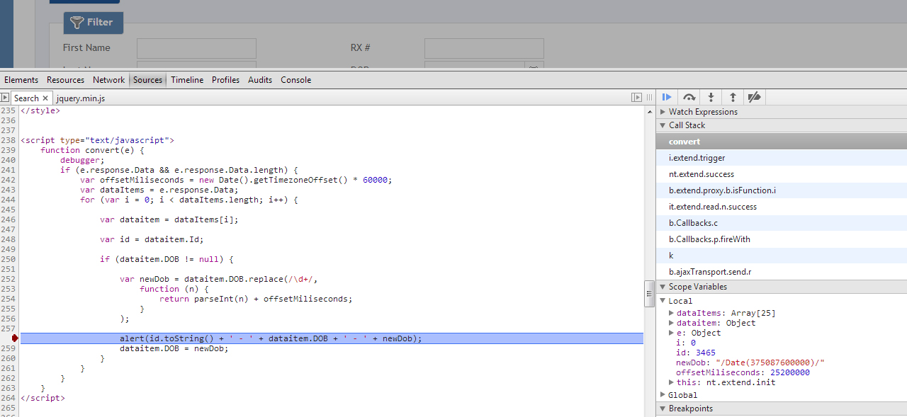 I tried the project you sent and now the behavior seems to be happening on my local machine. Please see the 3 attached files. "Grid.jpg" shows the DOB column value of 11/19/1981 while both the "Code.jpg" and "Database.jpg" images show the value should be 11/20/1981. Also you can see the "Client.jpg" which shows the client side "convert" is being hit.