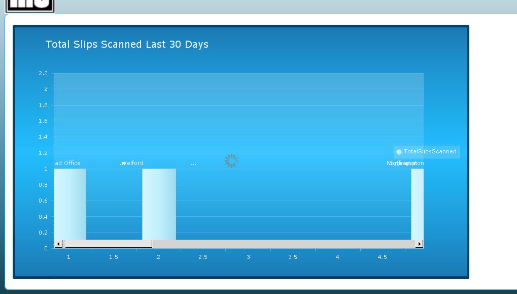 SELECT TOP 1000 [ShopId] ,[Name] ,[ScannedDate] ,[TotalSlipsScanned] ,[ScannedDay] FROM [EPOSShopScreen].[dbo].[vw_NoOfBetScanned]<asp:UpdatePanel ID="UpdatePanel1" runat="server" UpdateMode="Conditional"> <ContentTemplate> <telerik:RadChart ID="radChartNoOfBetScanned" runat="server" Skin="DeepBlue" Width="900px" Height="500px" DataSourceID="edsNoOfBetScanned" > <ClientSettings EnableZoom="false" ScrollMode="XOnly" XScale="4" /> <Appearance> <FillStyle FillType="ComplexGradient"> <FillSettings> <ComplexGradient> <telerik:GradientElement Color="26, 120, 179" /> <telerik:GradientElement Color="35, 189, 254" Position="0.5" /> <telerik:GradientElement Color="26, 120, 179" Position="1" /> </ComplexGradient> </FillSettings> </FillStyle> <Border Color="0, 66, 110" Width="5" /> </Appearance> <Series> <telerik:ChartSeries DataLabelsColumn="Name" DataXColumn="ScannedDay" DataYColumn="TotalSlipsScanned" Name="TotalSlipsScanned"> <Appearance> <FillStyle FillType="ComplexGradient"> <FillSettings> <ComplexGradient> <telerik:GradientElement Color="213, 247, 255" /> <telerik:GradientElement Color="193, 239, 252" Position="0.5" /> <telerik:GradientElement Color="157, 217, 238" Position="1" /> </ComplexGradient> </FillSettings> </FillStyle> <TextAppearance TextProperties-Color="White"> </TextAppearance> </Appearance> </telerik:ChartSeries> </Series> <Legend> <Appearance Dimensions-Margins="1px, 2%, 12%, 1px"> <ItemTextAppearance TextProperties-Color="White"> </ItemTextAppearance> <FillStyle GammaCorrection="False" MainColor="37, 255, 255, 255"> </FillStyle> <Border Color="76, 255, 255, 255" /> </Appearance> <TextBlock> <Appearance Position-AlignedPosition="Top" TextProperties-Color="LightSkyBlue"> </Appearance> </TextBlock> </Legend> <PlotArea> <XAxis> <Appearance Color="98, 183, 226" MajorTick-Color="98, 183, 226"> <MajorGridLines Color="98, 183, 226" Width="0" /> <TextAppearance TextProperties-Color="White"> </TextAppearance> </Appearance> <AxisLabel> <Appearance Dimensions-Paddings="1px, 1px, 10%, 1px"> </Appearance> <TextBlock> <Appearance TextProperties-Color="LightSkyBlue"> </Appearance> </TextBlock> </AxisLabel> </XAxis> <YAxis> <Appearance Color="98, 183, 226" MajorTick-Color="98, 183, 226" MinorTick-Color="98, 183, 226"> <MajorGridLines Color="120, 209, 248" /> <MinorGridLines Color="120, 209, 248" Width="0" /> <TextAppearance TextProperties-Color="White"> </TextAppearance> </Appearance> <AxisLabel> <TextBlock> <Appearance TextProperties-Color="LightSkyBlue"> </Appearance> </TextBlock> </AxisLabel> </YAxis> <Appearance Dimensions-Margins="19%, 90px, 12%, 9%"> <FillStyle MainColor="50, 255, 255, 255" SecondColor="Transparent"> </FillStyle> <Border Color="97, 180, 223" /> </Appearance> </PlotArea> <ChartTitle> <Appearance Dimensions-Margins="4%, 10px, 14px, 6%"> <FillStyle MainColor=""> </FillStyle> </Appearance> <TextBlock Text="Total Slips Scanned Last 30 Days"> <Appearance TextProperties-Color="White" TextProperties-Font="Verdana, 14pt"> </Appearance> </TextBlock> </ChartTitle> </telerik:RadChart> </ContentTemplate></asp:UpdatePanel><asp:EntityDataSource ID="edsNoOfBetScanned" runat="server" ConnectionString="name=EPOSShopScreenEntities" DefaultContainerName="EPOSShopScreenEntities" EntitySetName="vw_NoOfBetScanned"></asp:EntityDataSource>