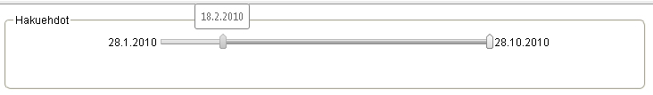 Private Sub InitDates() ' dtStart and dtEnd are fetched from db Dim dtStart As Date = CDate(getStartDate()).ToShortDateString Dim dtEnd As Date = CDate(getEndDate()).ToShortDateString lblSliderStartDate.Text = dtStart.ToShortDateString lblSliderEndDate.Text = dtEnd.ToShortDateString radSliderDates.MinimumValue = CInt(dtStart.ToOADate) radSliderDates.MaximumValue = CInt(dtEnd.ToOADate) radSliderDates.SelectionStart = CInt(dtStart.ToOADate) radSliderDates.SelectionEnd = CInt(dtEnd.ToOADate) radSliderDates.SmallChange = 1 End SubProtected Sub radSliderDates_ValueChanged(ByVal sender As Object, ByVal e As System.EventArgs) Handles radSliderDates.ValueChanged Dim dtStart As Date = Date.FromOADate(radSliderDates.SelectionStart.ToString) Dim dtEnd As Date = Date.FromOADate(radSliderDates.SelectionEnd.ToString) lblSliderStartDate.Text = dtStart.ToShortDateString lblSliderEndDate.Text = dtEnd.ToShortDateString End SubIn the project, the slider is used as a filter for ajaxified grid.
