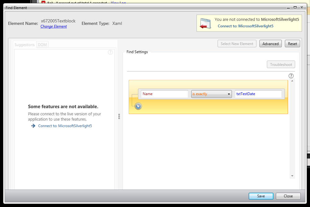 <sdk:Label AutomationProperties.AutomationId="lblTestDate" Name="txtTestDate" Grid.Row="2" Margin="5"/>In the Find Settings, I have the criteria "Name is exactly txtTestDate" (See Attached) This looks right. My suggestions tab is grayed out. Test Studio is giving a weard error in the log:
