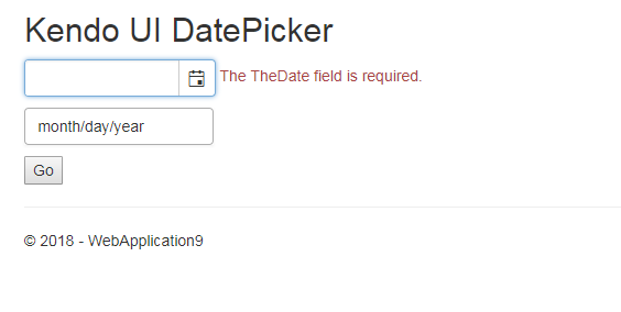 @model TestViewModel<form asp-action="Index" method="post"> <script type="text/javascript"> $.validator.setDefaults({ ignore: "" }); </script> <p> @(Html.Kendo().DatePickerFor(m => m.TheDate)) <span asp-validation-for="TheDate" class="text-danger"></span> </p> <p> @(Html.Kendo().DateInputFor(m => m.TheDate2)) <span asp-validation-for="TheDate2" class="text-danger"></span> </p> <input type="submit" value="Go" /></form>