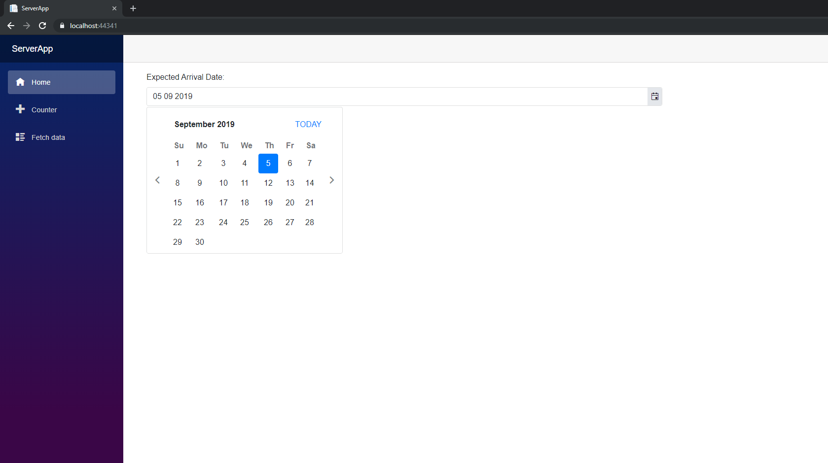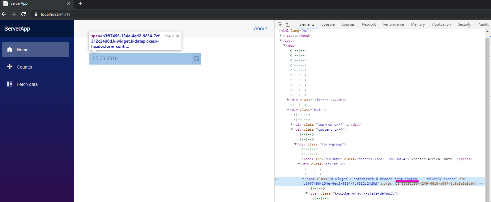 <div class="form-group"> <label for="dueDate" class="control-label col-md-4">Expected Arrival Date: </label> <div class="col-md-8"> <TelerikDatePicker Class="form-control" Format="dd/MM/yyyy" @bind-Value="@State.BillOfLadingVM.DueDate" /> </div> <ValidationMessage For="@(() => State.BillOfLadingVM.DueDate)" /></div>