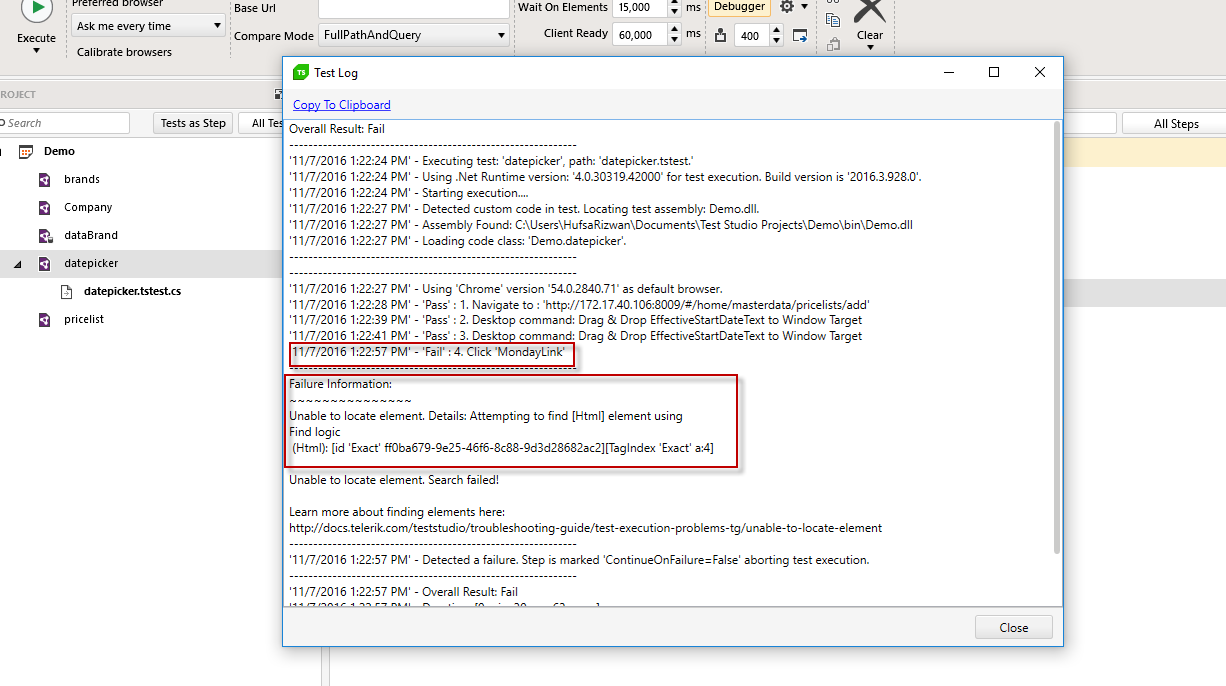 II am having some issues while automating a Kendo UI Datepicker with Telerik test studio. Attached is the recording steps screenshots & the failure log.