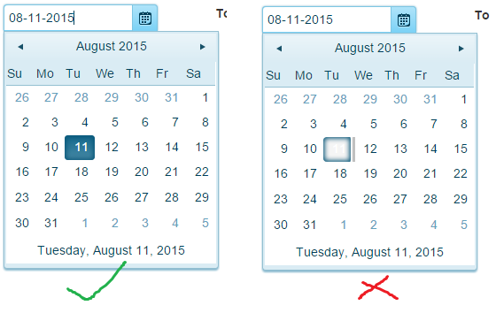 Could anyone explain why the right datepicker shows up differently from the left although same scripts were applied? How do I fix it so the right looks like the left?