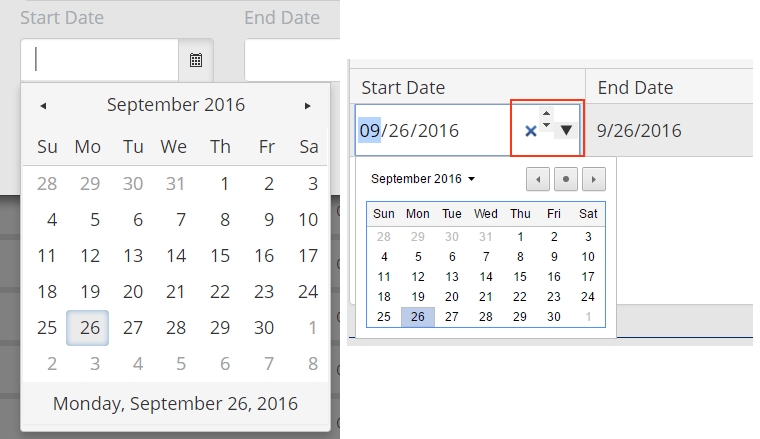 We have a site that is built with Bootstrap 3.0 style sheets. When we use a Kendo UI DatePicker as a standalone item on an input control, it looks very nice with the Kendo.Boostrap css. However, when we use a DatePicker inside a Kendo grid it has no bootstrap styling, plus there are other elements we see that we don't want user to have to deal with. See the attached picture to see how the two look so different. I circled in red the controls we don't want the user to see.