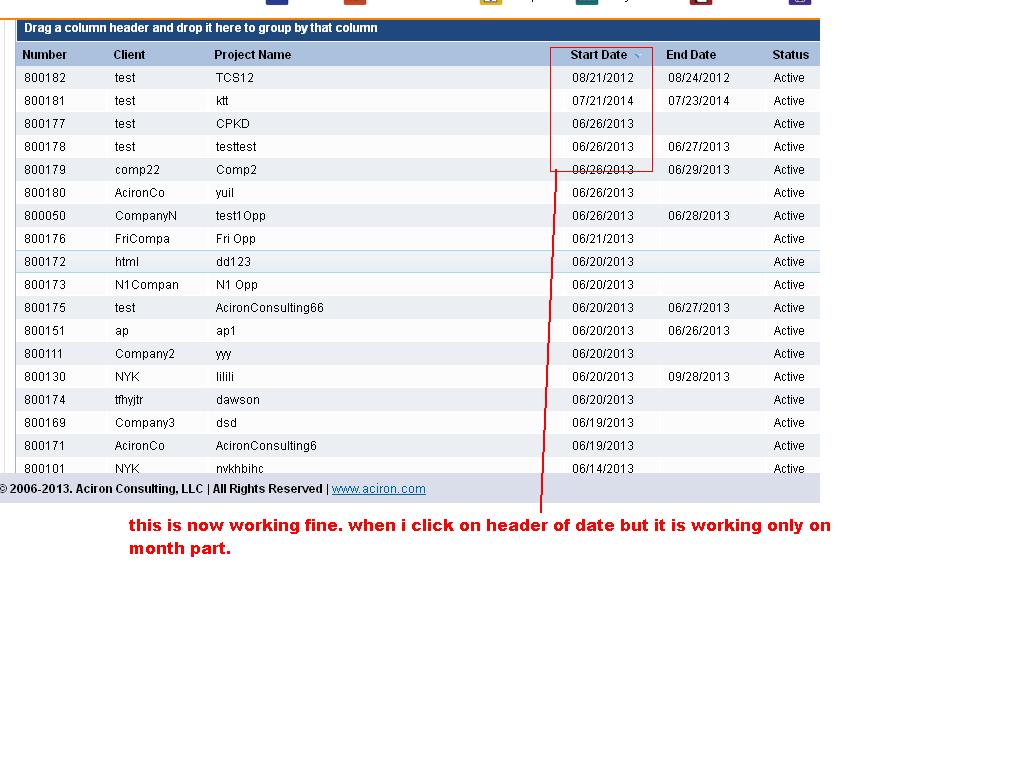 I have a column StartDate type Datetime. But when i click on column header for sorting it is not sorting properly in acs or desc. it is showing sorting only on month part of date