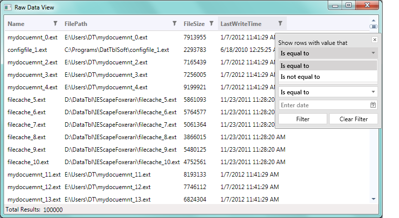 Public Function getRawDataListDT() As DataTable Dim returnCollection As New DataTable Dim newDataColumn As New DataColumn("Name") newDataColumn.DataType = GetType(String) returnCollection.Columns.Add(newDataColumn) newDataColumn = New DataColumn("FilePath") newDataColumn.DataType = GetType(String) returnCollection.Columns.Add(newDataColumn) newDataColumn = New DataColumn("FileSize") newDataColumn.DataType = GetType(Long) returnCollection.Columns.Add(newDataColumn) newDataColumn = New DataColumn("LastWriteTime") newDataColumn.DataType = GetType(DateTime) returnCollection.Columns.Add(newDataColumn) Dim maxItems As Integer = _showTop If maxItems < 1 Then maxItems = Integer.MaxValue End If Dim rnd As New Random() Dim sizernd As New Random() While returnCollection.Rows.Count < maxItems Dim dr As DataRow = returnCollection.NewRow() Dim path As String = "" Dim name As String = "" Dim nextRnd As Integer = rnd.Next(1, 4) Select Case nextRnd Case 1 path = "C:\Programs\DatTblSoft\" name = "configfile" dr("LastWriteTime") = DateTime.Parse("2010-02-28 09:23:45 PM").AddDays(109).AddSeconds(10900) Exit Select Case 2 path = "D:\DataTbl\IEScapeFoxerari\" name = "filecache" dr("LastWriteTime") = DateTime.Now Exit Select Case 3 path = "E:\Users\DT\" name = "mydocuemnt" dr("LastWriteTime") = DateTime.Now.AddDays(45).AddSeconds(789) Exit Select End Select dr("Name") = String.Format("{0}_{1}.ext", name, returnCollection.Rows.Count) dr("FilePath") = String.Format("{0}{1}", path, dr("Name").ToString()) dr("FileSize") = sizernd.Next(10, 10000000) returnCollection.Rows.Add(dr) End While Return returnCollectionEnd FunctionQ3 2011 (version: 2011.3.1116.35) solves this. The 'Less than ...' and 'Greater than ...' operators are now available as well.