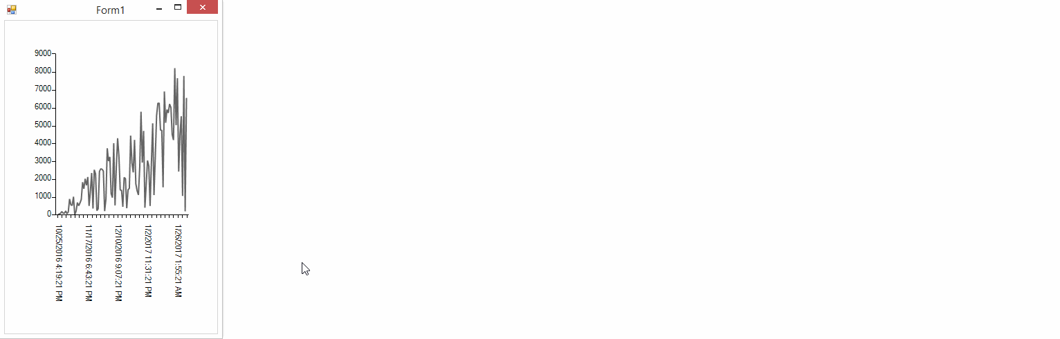 public partial class Form1 : Form{ private int step = 100; public Form1() { InitializeComponent(); LineSeries lineSeries = new LineSeries(); Random r = new Random(); for (int i = 0; i < 100; i++) { lineSeries.DataPoints.Add(new CategoricalDataPoint(i * r.Next(100), DateTime.Now.AddDays(i))); } DateTimeContinuousAxis continuousAxis = new DateTimeContinuousAxis(); continuousAxis.PlotMode = AxisPlotMode.OnTicksPadded; continuousAxis.LabelFitMode = AxisLabelFitMode.Rotate; continuousAxis.LabelInterval = 8; continuousAxis.LabelRotationAngle = 90; lineSeries.HorizontalAxis = continuousAxis; this.radChartView1.Series.Add(lineSeries); this.radChartView1.SizeChanged += radChartView1_SizeChanged; } private void radChartView1_SizeChanged(object sender, EventArgs e) { DateTimeContinuousAxis axis = radChartView1.Axes[0] as DateTimeContinuousAxis; int diff = (int)radChartView1.View.Viewport.Width - this.step; if (diff > 100 && axis.LabelInterval > 1) { axis.LabelInterval -= 1; this.step = (int)radChartView1.View.Viewport.Width; } else if (diff < -100) { axis.LabelInterval += 1; this.step = (int)radChartView1.View.Viewport.Width; } }}I am also sending you a short video showing the result on my end.