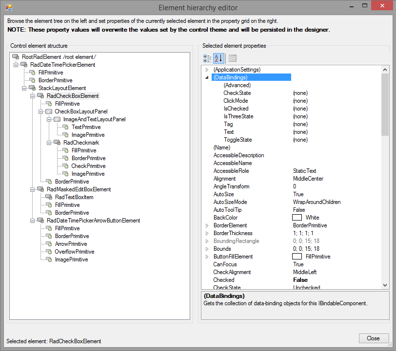 I have been trying to bind two properties to datetimepicker, the date itself and a boolean that i have bound to the RadCheckBoxElement.