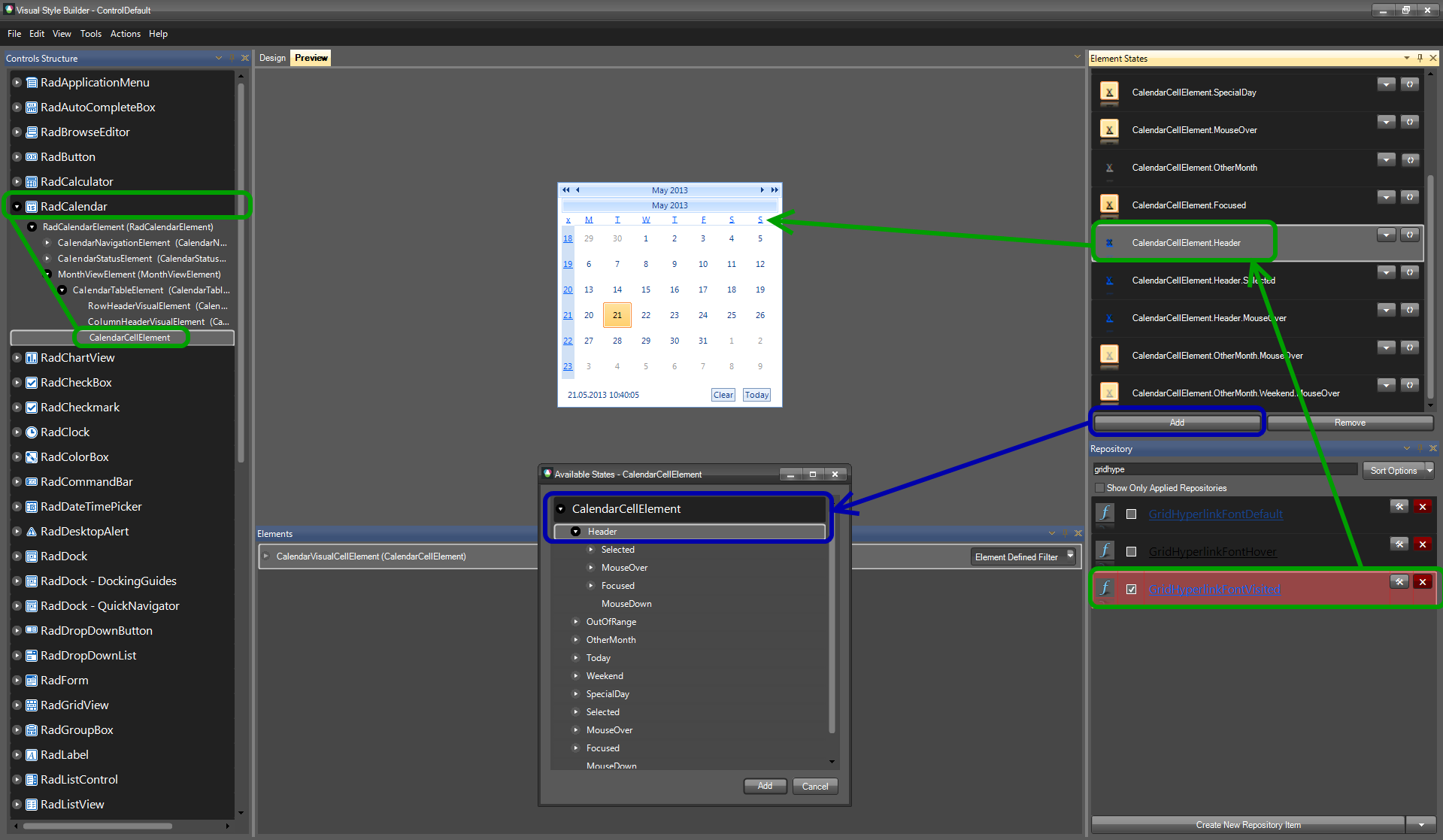 Please find attached a screenshot which illustrates what you have to do to apply a font to the cells you want. You have to apply the font repository to the CalendarCellElement.Header state (green indicators). If you do not have this state you can add it (blue indicators on the image).