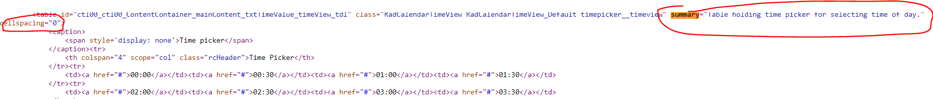 How do i remove the 'Summary' and 'Cellspacing' attributes from the Timeview? This is causing my website to not validate through https://validator.w3.org/.