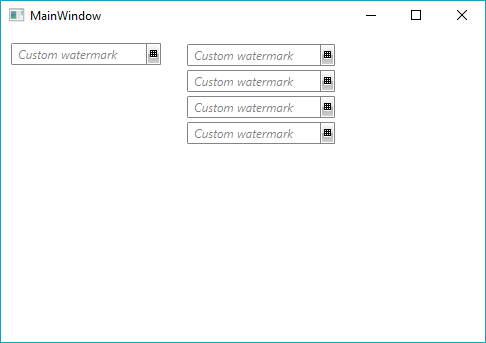 <Window x:Class="RadDateTimePickerDemo.MainWindow" xmlns:telerik="http://schemas.telerik.com/2008/xaml/presentation" xmlns:local="clr-namespace:RadDateTimePickerDemo" mc:Ignorable="d" Title="MainWindow" Height="350" Width="500"> <Grid Margin="10"> <Grid.ColumnDefinitions> <ColumnDefinition Width="150"/> <ColumnDefinition Width="20"/> <ColumnDefinition Width="160"/> </Grid.ColumnDefinitions> <telerik:RadDateTimePicker VerticalAlignment="Top" Margin="0,2,0,0" InputMode="DatePicker" DateTimeWatermarkContent="Custom watermark"/> <ListBox x:Name="listBox" Grid.Column="2" HorizontalContentAlignment="Stretch" BorderThickness="0" Padding="0"> <ListBox.ItemTemplate> <DataTemplate> <telerik:RadDateTimePicker InputMode="DatePicker" DateTimeWatermarkContent="Custom watermark"/> </DataTemplate> </ListBox.ItemTemplate> </ListBox> </Grid></Window>I attached screenshots for different versions. Project's .net version - 4.6, Windows 10, 64bit.