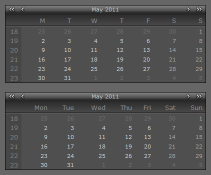 <telerik:RadCalendar id="DatePicker1" runat="server" Skin="Black" EnableMultiSelect="False" Width="400" FirstDayOfWeek="Monday" > </telerik:RadCalendar><br /> <br /> <telerik:RadCalendar id="DatePicker2" runat="server" Skin="Black" EnableMultiSelect="False" Width="400" FirstDayOfWeek="Monday" DayNameFormat="Short" > </telerik:RadCalendar>