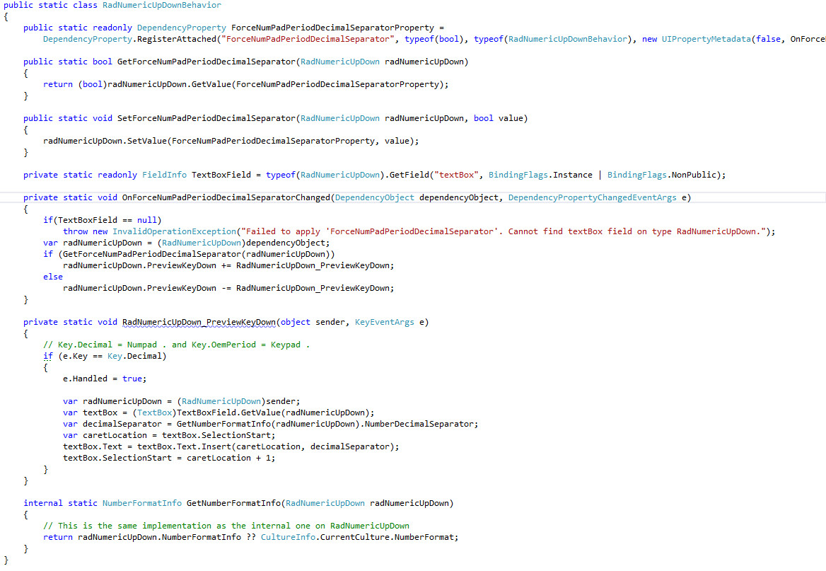 public static class RadNumericUpDownBehavior { /// <summary> /// Makes sure that the num-pad period is interpreted as a decimal separator. /// /// For culture nl-BE, the NumberDecimalSeparator = comma, the NumberGroupSeparator = blank space. /// There is a clear distinction between "Key.OemPeriod", being the 'regular' period on a keyboard, and "Key.Decimal", being the period on the num-pad. /// /// For keyboard layout of Belgium - Period. This means that: /// - while typing text in for instance MS Word, the "Key.Decimal" will be interpreted as a period /// - mathematical software, like for instance MS Excel, will Always interpret the "Key.Decimal" as a decimal separator. /// (yes, that's right, even though the NumberDecimalSeparator for the nl-BE culture is a comma). /// /// When the culture is set to nl-BE, Telerik's RadNumericUpDown interprets the comma as a decimal separator. So far so good. /// However, when the "Key.Decimal" is pressed, this is not interpreted as a decimal separator, but just like a "Key.OemPeriod" is. /// This behavior fixes that and interpretes the "Key.Decimal" as a decimal separator. /// /// Was posted on Telerik forum: http://www.telerik.com/community/forums/wpf/numeric-up-down.aspx /// </summary> public static readonly DependencyProperty ForceNumPadPeriodDecimalSeparatorProperty = DependencyProperty.RegisterAttached("ForceNumPadPeriodDecimalSeparator", typeof(bool), typeof(RadNumericUpDownBehavior), new UIPropertyMetadata(false, OnForceNumPadPeriodDecimalSeparatorChanged)); public static bool GetForceNumPadPeriodDecimalSeparator(RadNumericUpDown radNumericUpDown) { return (bool)radNumericUpDown.GetValue(ForceNumPadPeriodDecimalSeparatorProperty); } public static void SetForceNumPadPeriodDecimalSeparator(RadNumericUpDown radNumericUpDown, bool value) { radNumericUpDown.SetValue(ForceNumPadPeriodDecimalSeparatorProperty, value); } private static readonly FieldInfo TextBoxField = typeof(RadNumericUpDown).GetField("textBox", BindingFlags.Instance | BindingFlags.NonPublic); private static void OnForceNumPadPeriodDecimalSeparatorChanged(DependencyObject dependencyObject, DependencyPropertyChangedEventArgs e) { if (TextBoxField == null) throw new InvalidOperationException("Failed to apply 'ForceNumPadPeriodDecimalSeparator'. Cannot find textBox field on type RadNumericUpDown."); var radNumericUpDown = (RadNumericUpDown)dependencyObject; if (GetForceNumPadPeriodDecimalSeparator(radNumericUpDown)) radNumericUpDown.PreviewKeyDown += RadNumericUpDown_PreviewKeyDown; else radNumericUpDown.PreviewKeyDown -= RadNumericUpDown_PreviewKeyDown; } private static void RadNumericUpDown_PreviewKeyDown(object sender, KeyEventArgs e) { // Key.Decimal = Numpad . and Key.OemPeriod = Keypad . if (e.Key != Key.Decimal) return; e.Handled = true; var radNumericUpDown = (RadNumericUpDown)sender; var textBox = (TextBox)TextBoxField.GetValue(radNumericUpDown); var decimalSeparator = radNumericUpDown.ValueFormat == ValueFormat.Currency ? GetNumberFormatInfo(radNumericUpDown).CurrencyDecimalSeparator : GetNumberFormatInfo(radNumericUpDown).NumberDecimalSeparator; // Simulate the normal RadNumericUpDown behavior when all text is selected: // when a decimal separator is typed, clear all text and continue at caret position next to separator. if (textBox.SelectionLength == textBox.Text.Length) { textBox.Text = decimalSeparator; textBox.Select(textBox.Text.Length, 0); } else { var caretLocation = textBox.SelectionStart; textBox.Text = textBox.Text.Insert(caretLocation, decimalSeparator); textBox.Select(caretLocation + 1, 0); } } /// <summary> /// This is the same implementation as the internal one on RadNumericUpDown /// </summary> /// <param name="radNumericUpDown"></param> /// <returns></returns> internal static NumberFormatInfo GetNumberFormatInfo(RadNumericUpDown radNumericUpDown) { return radNumericUpDown.NumberFormatInfo ?? CultureInfo.CurrentCulture.NumberFormat; } }0