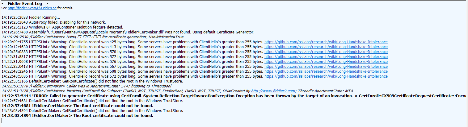 I am trying to enable "Decrypt HTTPS Traffic" in Fiddler (Tools > HTTPS) and I keep getting an error in the log file.