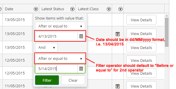 I'm wondering if it's possible to set the default operator of a second date filter different to the first. I would like the first filter operator to default to "After or equal to" and the 2nd operator to default to "Before or equal to".
