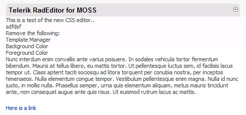 We are evaluating Rad Editor (version 5) for MOSS. We have a custom theme for our site and after using the Rad Editor, we noticed that the styles are not the same as our theme. What my end result is that when ever a user adds this webpart to their site, and adds content, the fonts and styles would be the same fonts as our custom theme. I have read the documentation at http://www.telerik.com/support/kb/aspnet-ajax/sharepoint/populating-radeditor-s-apply-css-class-dropdown-with-custom-styles.aspx and followed these instructions, but it seems that when I add content to the page it does not follow the new CSS file that I created at /Program Files/Common Files/Microsoft Shared/web server extensions/wpresources/custom.css. I added this to my toolsfile.xml
