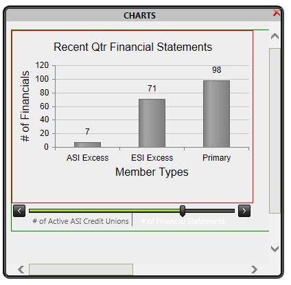 <div style="width: 98%; margin: 0 auto; overflow: auto; border: 1px solid green;"> <div id="slide_00" class="slide" style="border: 1px solid red; height: 250px; width: 350px;"> <telerik:RadHtmlChart runat="server" Width="350px" Height="225px" ID="RadHtmlChart1" DataSourceID="SqlDataSource1"> <PlotArea> <Series> <telerik:ColumnSeries DataFieldY="NumOfMembers"> <TooltipsAppearance Color="White" /> </telerik:ColumnSeries> </Series> <XAxis DataLabelsField="MemberType"> <TitleAppearance Text="Member Types"> <TextStyle Margin="5" /> </TitleAppearance> <MajorGridLines Visible="false" /> <MinorGridLines Visible="false" /> </XAxis> <YAxis> <TitleAppearance Text="Active Members"> <TextStyle Margin="5" /> </TitleAppearance> <MinorGridLines Visible="false" /> </YAxis> </PlotArea> <ChartTitle Text="# of Active ASI Credit Unions"> </ChartTitle> </telerik:RadHtmlChart> </div> <div id="slide_01" class="slide" style="border: 1px solid red; height: 250px; width: 350px;""> <telerik:RadHtmlChart runat="server" Width="350px" Height="225px" ID="RadHtmlChart2" DataSourceID="SqlDataSource2"> <PlotArea> <Series> <telerik:ColumnSeries DataFieldY="TotCount"> <TooltipsAppearance Color="White" /> </telerik:ColumnSeries> </Series> <XAxis DataLabelsField="Coverage"> <TitleAppearance Text="Member Types"> <TextStyle Margin="5" /> </TitleAppearance> <MajorGridLines Visible="false" /> <MinorGridLines Visible="false" /> </XAxis> <YAxis> <TitleAppearance Text="# of Financials"> <TextStyle Margin="5" /> </TitleAppearance> <MinorGridLines Visible="false" /> </YAxis> </PlotArea> <ChartTitle Text="Recent Qtr Financial Statements"> </ChartTitle> </telerik:RadHtmlChart> </div> <telerik:RadSlider ID="RadSlider1" runat="server" TrackPosition="TopLeft" Value="0" ItemType="Item" Skin="Black" Width="350px" Height="40px" OnClientValueChanged="UpdateVisibleSlide" OnClientLoad="UpdateVisibleSlide"> <Items> <telerik:RadSliderItem Text="# of Active ASI Credit Unions"></telerik:RadSliderItem> <telerik:RadSliderItem Text="# of Financial Statements"></telerik:RadSliderItem> </Items> </telerik:RadSlider> </div>