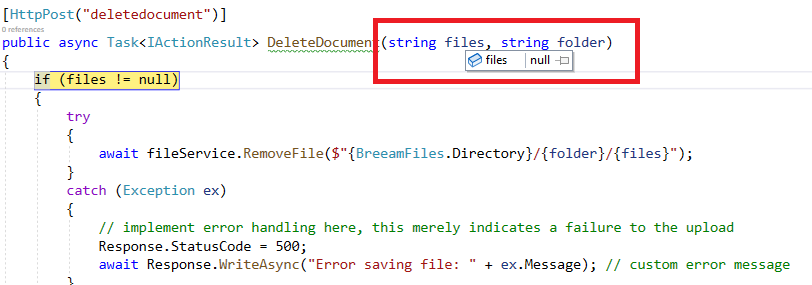 public async Task<IActionResult> DeleteDocument(string files)