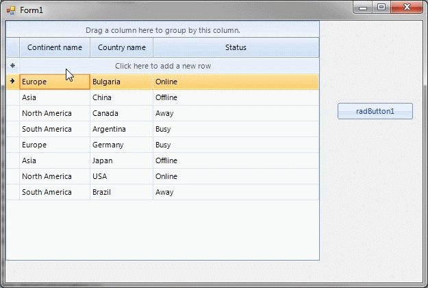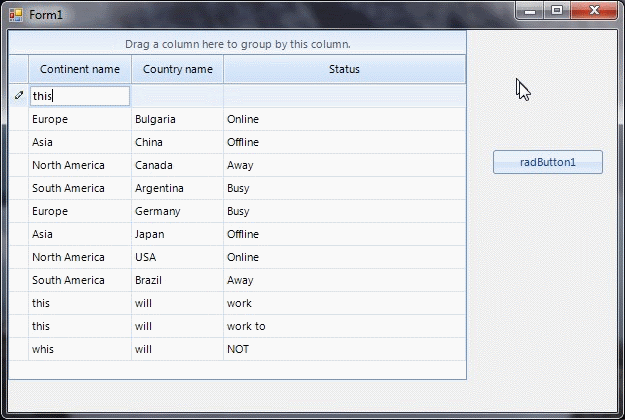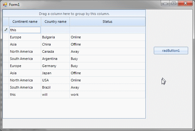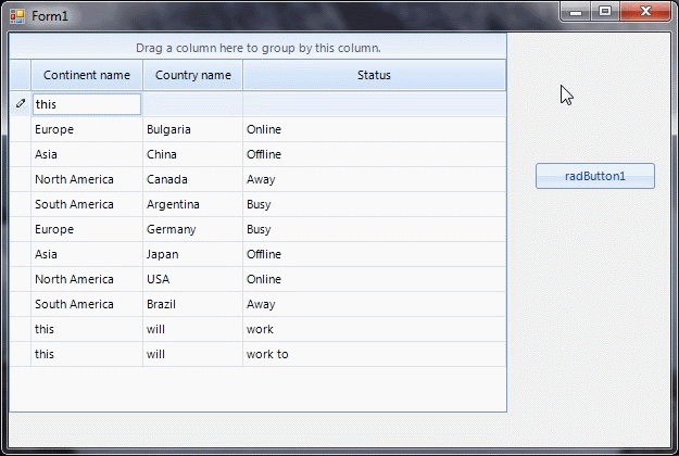 void radGridView1_UserAddedRow(object sender, GridViewRowEventArgs e){ Timer timer = new Timer(); timer.Tick += new EventHandler(timer_Tick); timer.Interval = 100; timer.Start();}void timer_Tick(object sender, EventArgs e){ Timer timer = (Timer)sender; timer.Stop(); timer.Dispose(); radGridView1.CurrentRow = null;}Find attached a modified version of my previous sample project, which I hope will help you.