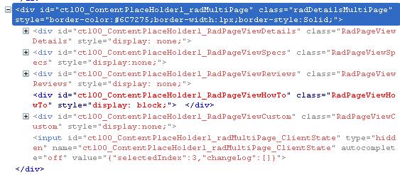 <rad:RadTabStrip ID="radDetailsTabs" CssClass="radDetailsTabs" runat="server" MultiPageID="radmultipage" BorderWidth="0" OnClientTabSelected="" Skin="Vista" Style="padding: 0; margin: 0;"> <Tabs> <rad:RadTab Text="Details" Selected="true" Width="95px"> </rad:RadTab> <rad:RadTab Text="Specifications" Width="95px"> </rad:RadTab> <rad:RadTab Text="Reviews" Width="95px"> </rad:RadTab> <rad:RadTab Text="How To" Width="95px"> </rad:RadTab> <rad:RadTab Text="Custom" Width="95px"> </rad:RadTab> </Tabs> </rad:RadTabStrip>Then I have some JS that runs on pageload that will remove one of the tabs if its not needed...