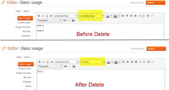 Looking at the source, originally the text is two paragraphs. After deleting the line 2 text is a span with an inline style of font-size= .75em