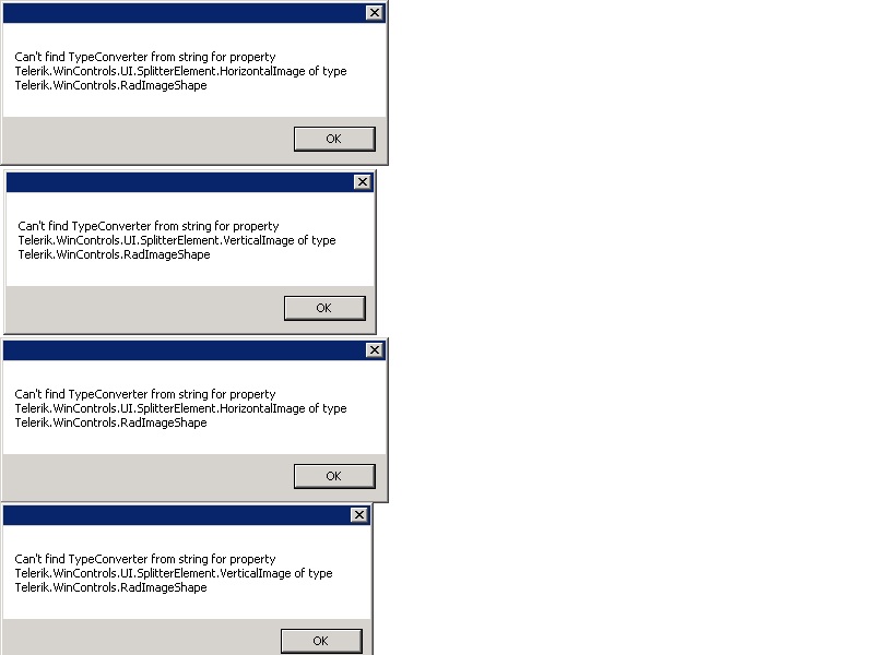 With 2015 Q1 SP1 (2015.1.331.40) built in Release40 configuration we are experiencing a strange issue when our application is installed on client machines. When one particular form is opened we get a series of nine pop-up 'TypeConverter' messages (please see the attached doc which shows the first four) before the form displays.
