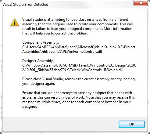 Now the problem is that as soon as we change the references in our Visual Studio 2010 project from the Telelerik.WinControls.*.dlls to the merged assembly, the designer view of the form fails to load and crashes Visual Studio 2010. If the designer view is not loaded, we can run in debug mode, etc and there are no problems with the resulting application deployed with the merged assembly.
