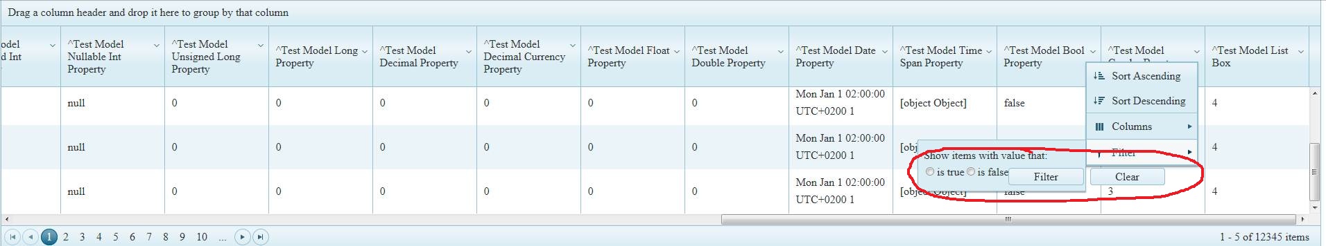 The grid renders ok but when I try to filter the Boolean Column it looks like this