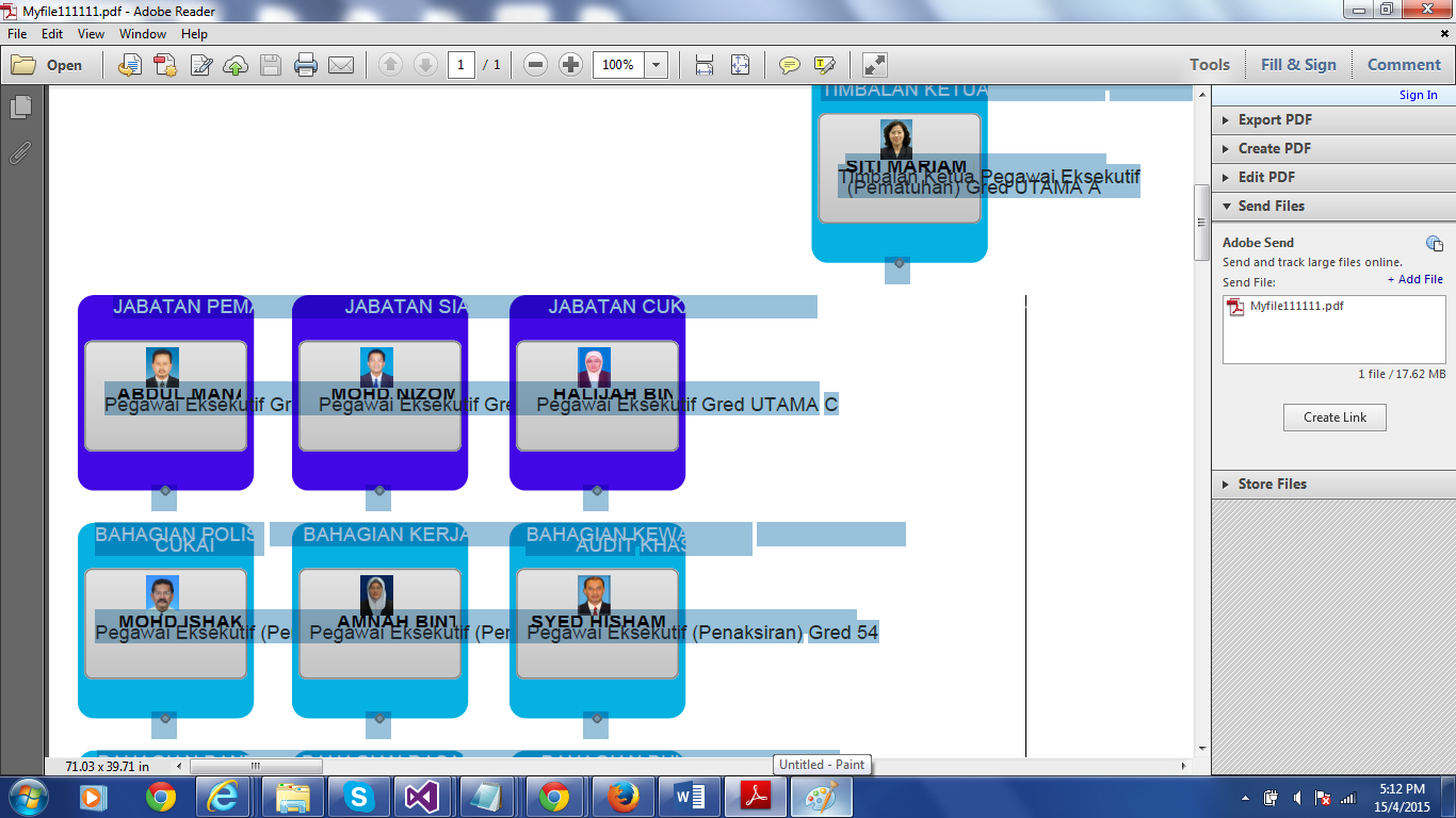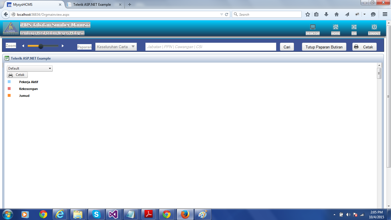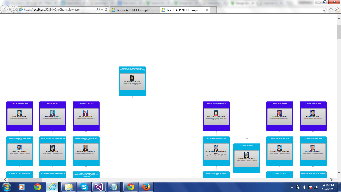 <telerik:RadOrgChart runat="server" ID="RadOrgChart1" EnableCollapsing="true" EnableGroupCollapsing="true" Orientation="Vertical"> <Nodes> <telerik:OrgChartNode> <RenderedFields> <telerik:OrgChartRenderedField Text="CEOs" /> </RenderedFields> <GroupItems> <telerik:OrgChartGroupItem Text="John Bravo" /> </GroupItems> <Nodes> <telerik:OrgChartNode> <GroupItems> <telerik:OrgChartGroupItem Text="Don Marko"> <RenderedFields> <telerik:OrgChartRenderedField Text="Team Leader" /> </RenderedFields> </telerik:OrgChartGroupItem> </GroupItems> <Nodes> <telerik:OrgChartNode> <GroupItems> <telerik:OrgChartGroupItem Text="Hun-ni Ho" /> <telerik:OrgChartGroupItem Text="Lukas Brezina" /> <telerik:OrgChartGroupItem Text="Viktor Varga" /> </GroupItems> </telerik:OrgChartNode> </Nodes> </telerik:OrgChartNode> </Nodes> </telerik:OrgChartNode> </Nodes></telerik:RadOrgChart><div class="legendA" style="width: 10px; height: 10px; background-color: rgba(46, 164, 252, 0.5); display: inline-block;"></div><asp:Label ID="Label1" Text="Pekerja Aktif" runat="server"></asp:Label><div></div><div class="legendB" style="width: 10px; height: 10px; background-color: rgba(222, 29, 29, 0.6); display: inline-block;"></div><asp:Label ID="Label2" Text="Kekosongan" runat="server"></asp:Label><div></div><div class="legendC" style="width: 10px; height: 10px; background-color: rgba(255, 143, 46,1); display: inline-block;"></div><asp:Label ID="Label3" Text="Jumud" runat="server"></asp:Label><telerik:RadClientExportManager runat="server" ID="RadClientExportManager1"> <PdfSettings FileName="Myfile.pdf" /></telerik:RadClientExportManager><input type="button" onclick="exportElement()" value="export" /><script type="text/javascript"> function exportElement() { var exp = $find("<%= RadClientExportManager1.ClientID %>"); exp.exportPDF($telerik.$("html")); }</script>Regards,