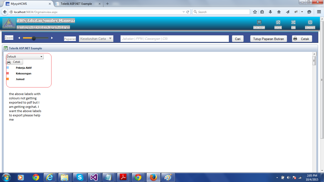 I am using RadOrgchart to Pdf control in my project.I am exporting normal label (Pekerja Aktif,Kekosongan,Jumud) and Div( <div class="legendA" style="width: 10px; height: 10px; background-color: rgba(46, 164, 252, 0.5);"></div>