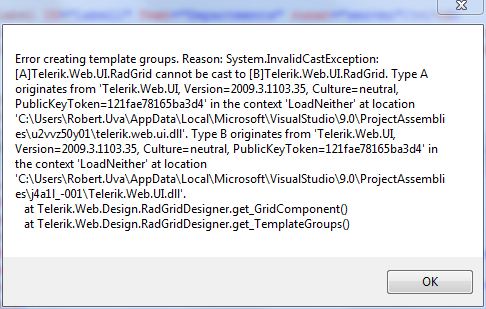 I'm getting a strange design-time error viewing a RADGrid in VS2008. I've attached a image of the error window. It was working fine and something I did recently caused this but I can't nail it down. What could cause this error?