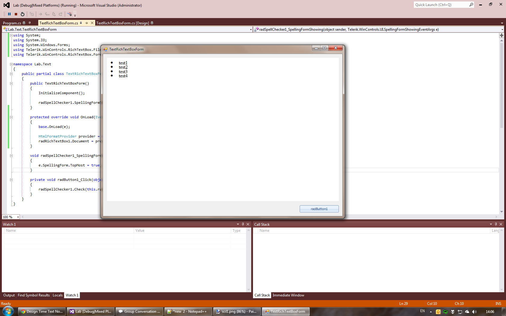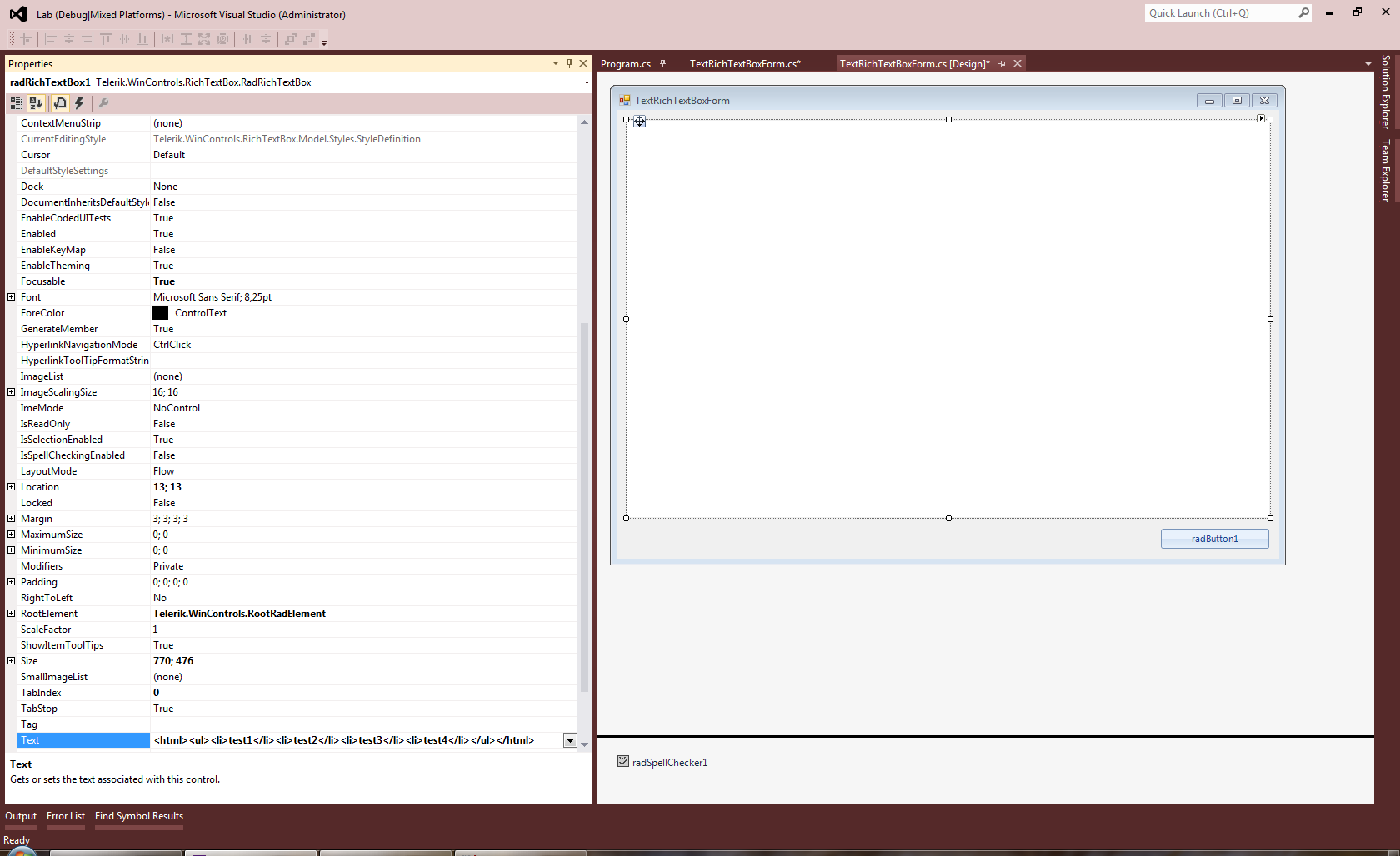 I feel like this is something obvious that I am overlooking. I want to insert a bulleted list into a richtextbox at design time. I use the MarkupEditor to get the list in and it displays the text with the proper formatting in the Text property but nothing shows up in the richtextbox itself. The help document states that design time text can be inserted and made read only. What am I missing here?